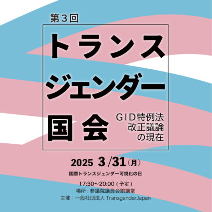 お知らせ イベントトランスジェンダー国会開催更新日:2025年3月29日2025年3月1日 最高裁判所大法廷が2023年10月25日に「性同一性障害者の性別の取扱いの特例に関する法律」(GID特例法)の …